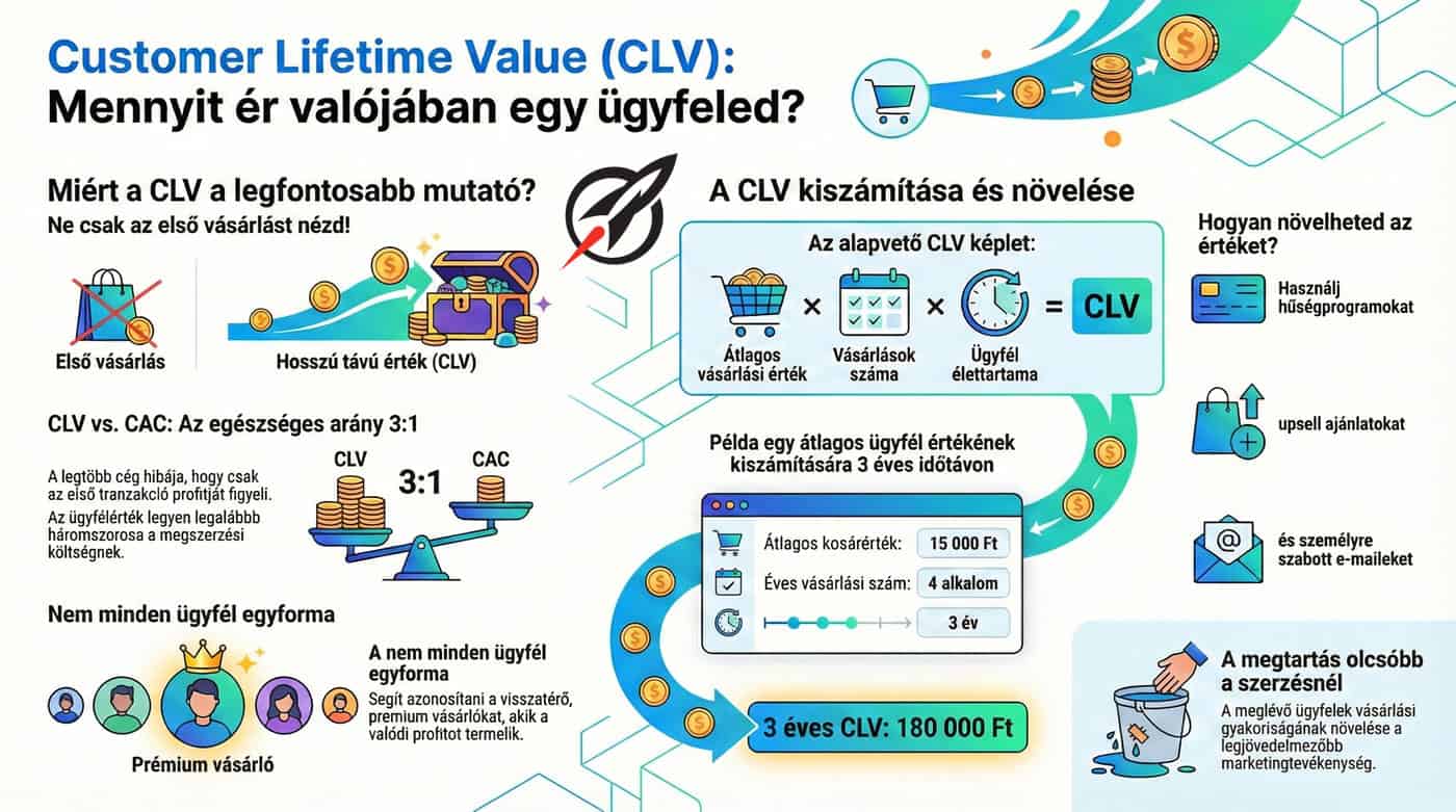 Ha egy ügyfél megszerzése 10 000 Ft-ba kerül, de a teljes élettartam alatt csak 12 000 Ft bevételt hoz, akkor a modell fenntarthatatlan. Ha viszont 10 000 Ft CAC mellett 80 000 Ft CLV-t termel, akkor bőven van mozgástered skálázni.